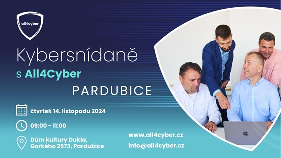 Potkejte se s členy All4Cyber v regionech! Zajímá vás, jak posílit kybernetickou bezpečnost vaší organizace a ochránit citlivá data v souladu s aktuální legislativou? Připojte se k naší kybersnídani, která se uskuteční 14. listopadu 2024 od 9:00 do 11:00 v Domě kultury Dukla v Pardubicích. Čekají na vás informace o nejmodernějších strategiích a nástrojích na ochranu proti kybernetickým útokům nebo konkrétní tipy pro zvýšení odolnosti vaší organizace a splnění legislativních požadavků. Setkejte se s odborníky a kolegy z oboru, vyměňte si zkušenosti a navazujte nová partnerství! Účast je zdarma, ale kapacita je omezená. Neváhejte se připojit a posilte svou organizaci proti kybernetickým hrozbám!