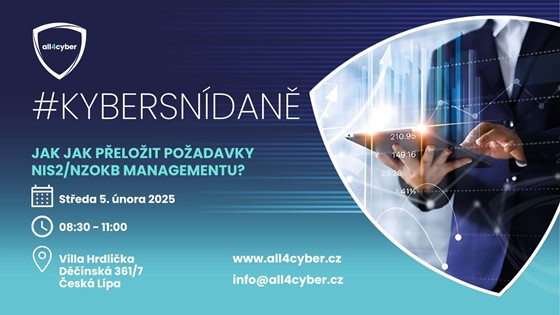 Zajímá vás, jak se připravit na chystanou legislativu v souvislosti s plánovanou aplikací NIS2/nZoKB do české legislativy? Připojte se k naší #Kybersnídani, která se uskuteční 5. února 2025 od 8:30 do 11:00 ve Villa Hrdlička v České Lípě.